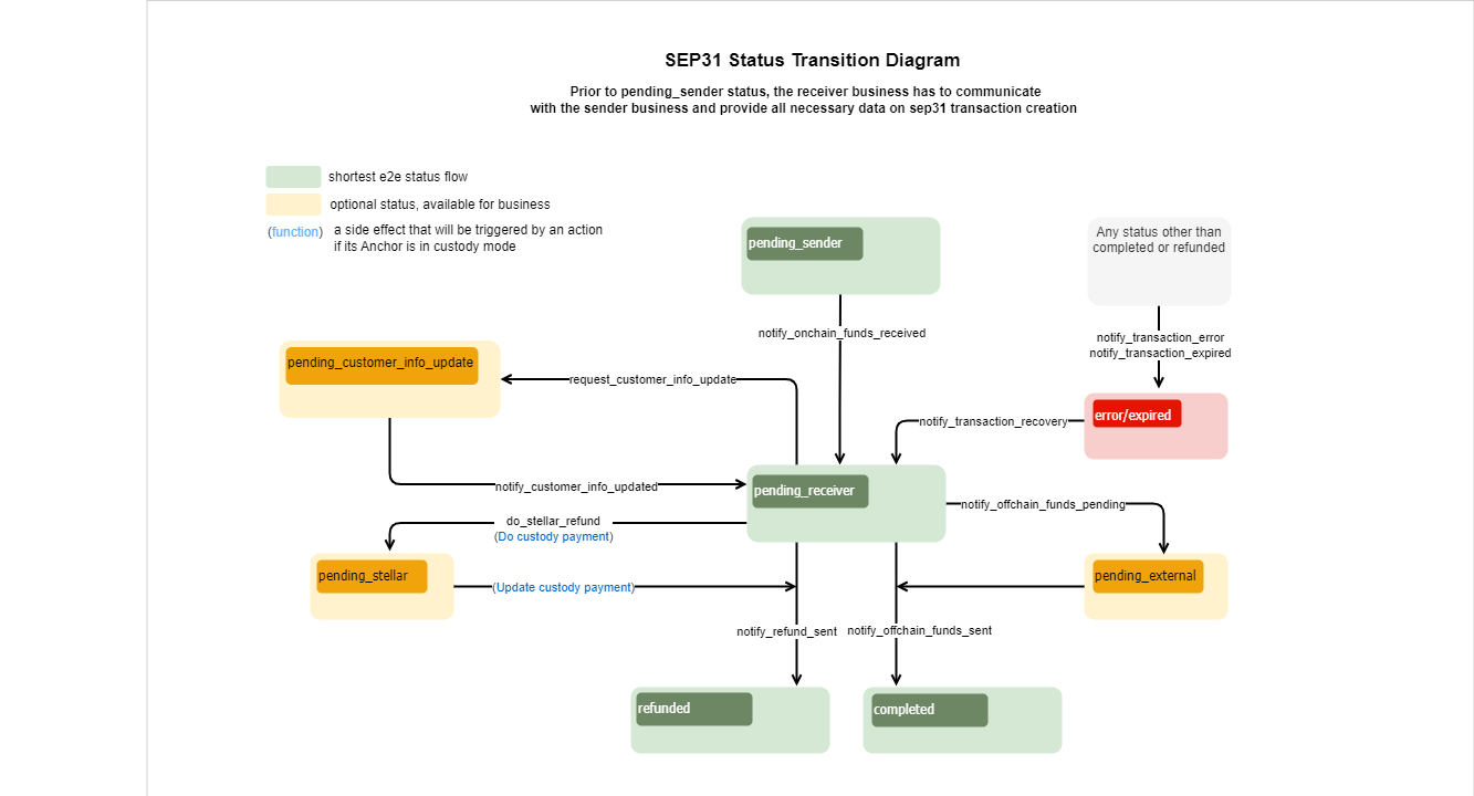 In some cases, the Receiving Anchor might need to request an updated information from the Sending Anchor. For example, the bank tells the Receiving Anchor that the provided Receiving Client's name is incorrect or missing a middle initial. Since this information was sent via SEP-12, the transaction should go into the pending_customer_info_update status until the Sending Anchor makes another SEP-12 PUT /customer request to update. The Sending Anchor can check which fields need to be updated by making a SEP-12 GET /customer request including the id or account & memo parameters. The Receiving Anchor should respond with a NEEDS_INFO status and last_name included in the fields described.
